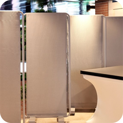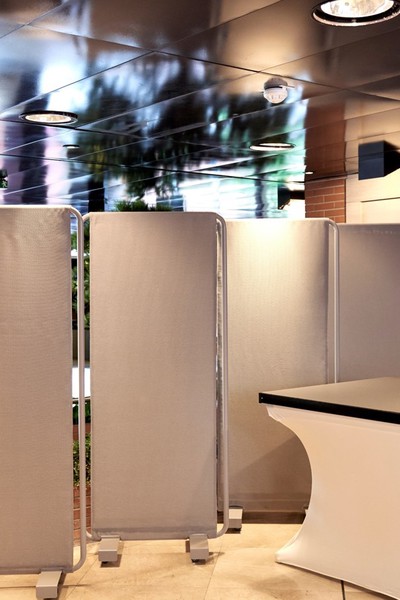 Parason est un paravent acoustique mobile destiné aux collectivités et aux RIE. Sa structure en métal et son piètement permettent d'emboîter plusieurs paravents les uns dans les autres, tel un petit train, et de cloisonner l'espace partiellement ou totalement, tout en pouvant être déplacé facilement.