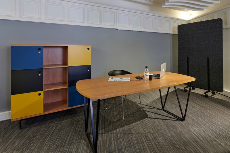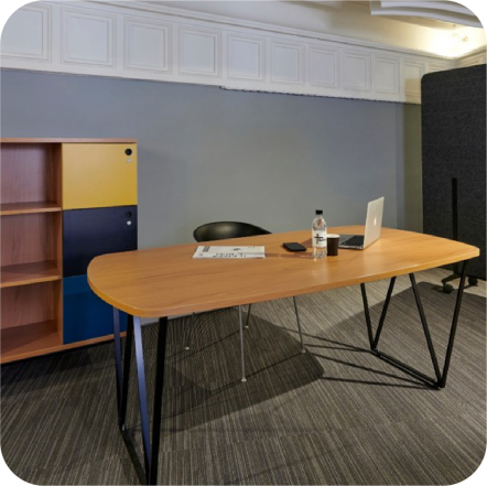 Piétement en métal et plateau en PPSM, également disponible en placage bois sur demande.