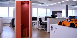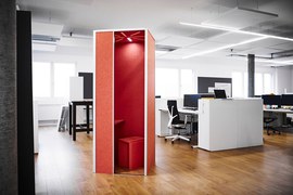 Une pièce dans une pièce pour des conversations courtes et ciblées, debout ou assis. Grâce à l’étagère réglable en hauteur intégrée, les documents ou l’ordinateur portable peuvent également trouver leur place. La cabine silencieuse peut être assemblée sans outils, ses sept pièces ne pesant que 42 kg.