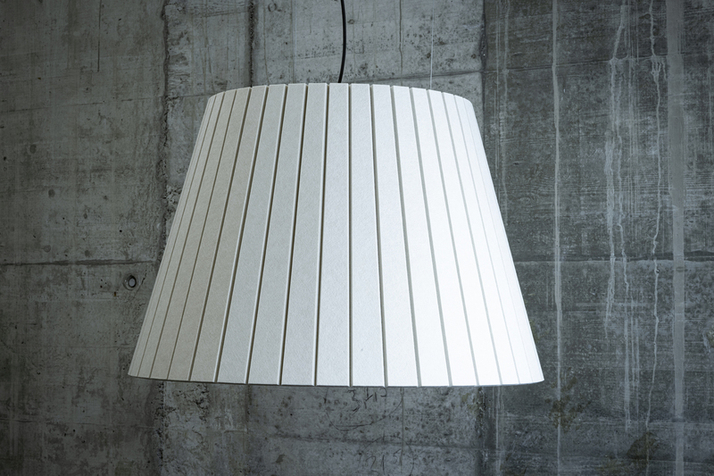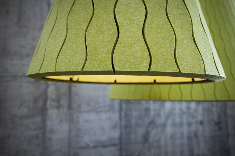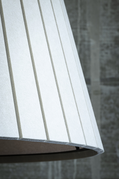 EchoLED® CONE est disponible en cinq tailles, l'abat-jour en matériau acoustique PET contient jusqu'à 360 bouteilles en PET recyclées. Le plafonnier est particulièrement attrayant grâce aux différentes épaisseurs de matériau, aux 21 couleurs expressives et aux designs variés.